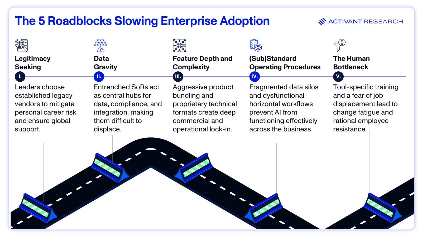 The critical complication is that this is not a simple AI-versus-non-AI battle. Incumbents are racing to bolt AI onto aging tech stacks, using their scale and distribution to dominate the narrative. This tension between agility and legacy sits at the heart of enterprise AI adoption. Even when the will to modernize exists, decades of technical debt and deeply embedded systems make transformation far harder in practice than in principle. Beneath the hype, most organizations remain stuck in enterprise inertia, opting for the path of least resistance by purchasing tools without dismantling established hierarchies. In most cases, the barrier to adoption is not the technology itself, but the structural and cultural hurdles that keep legacy systems anchored at the center of the enterprise tech stack.