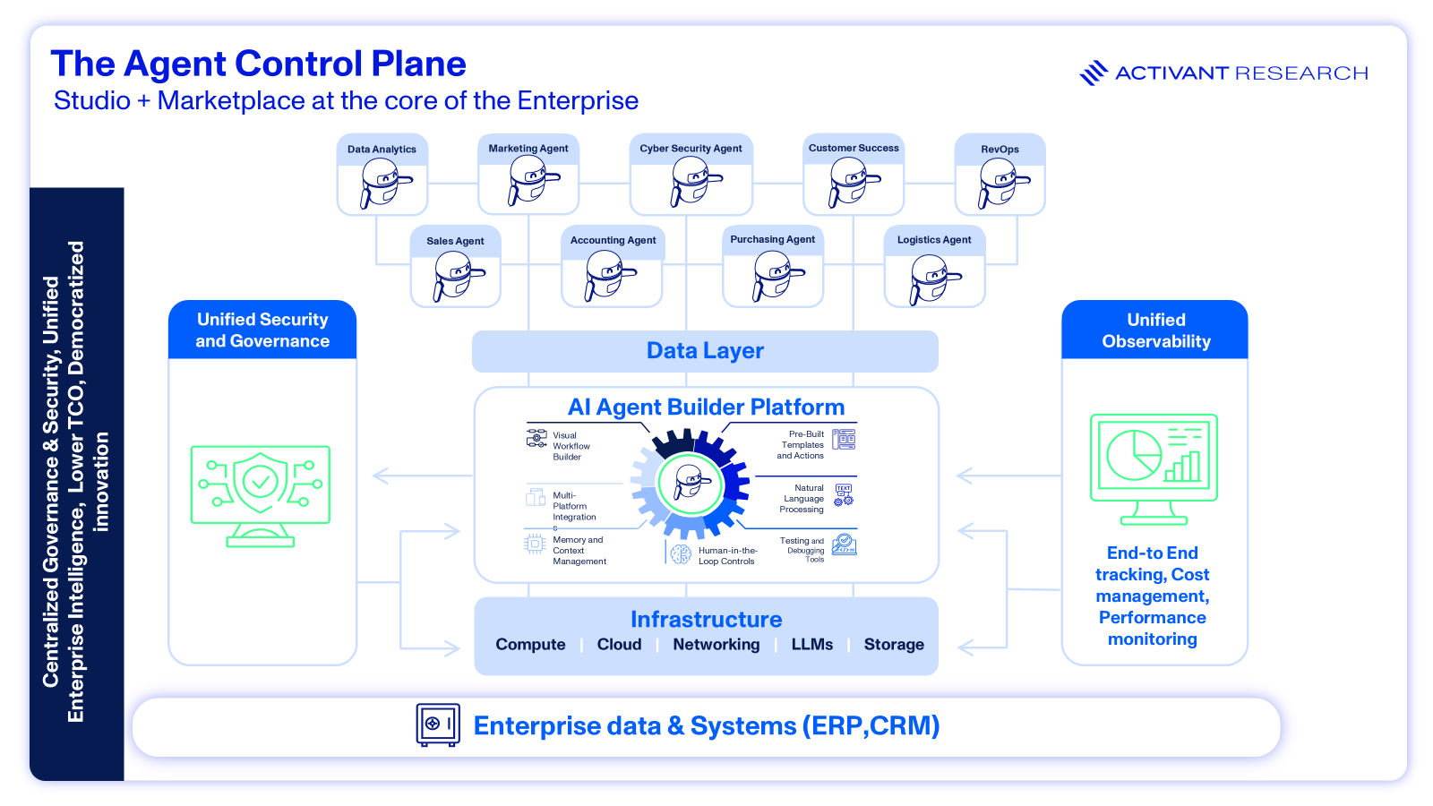 This architecture functions as a unified control plane, transforming AI from a siloed feature into a governed, enterprise-wide system. Visually, this platform sits at the center of the enterprise: